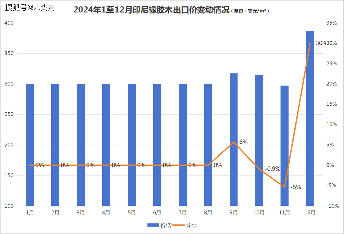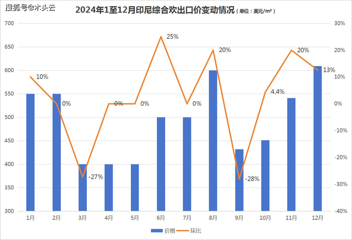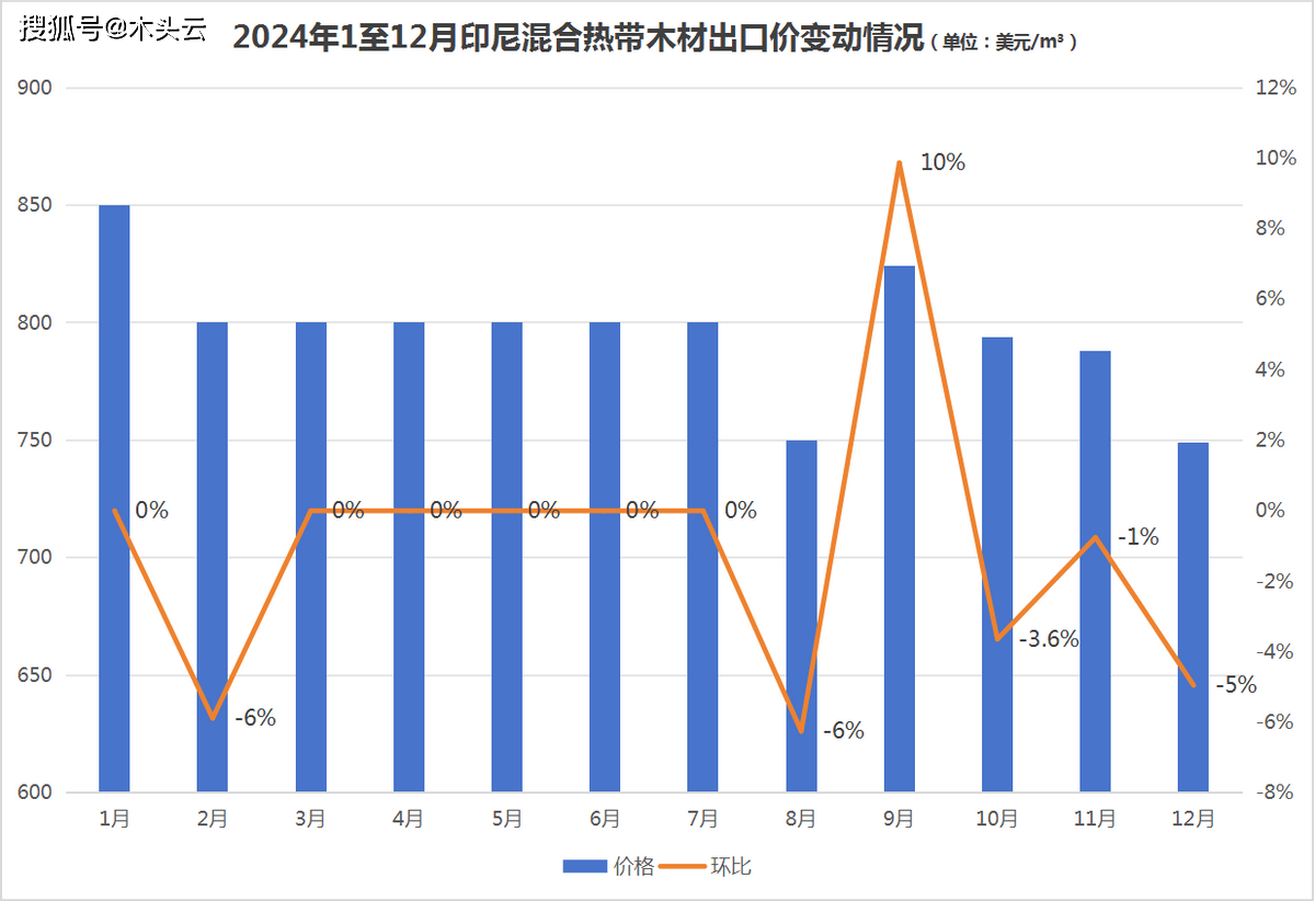 2024年印尼分析欢出口价表示较为波动,环比下井27%至400美元/立方;最高价呈现正在12月,其余月份,如1月环比2023年12月增加了10%;6月以及11月均环比增加20%。